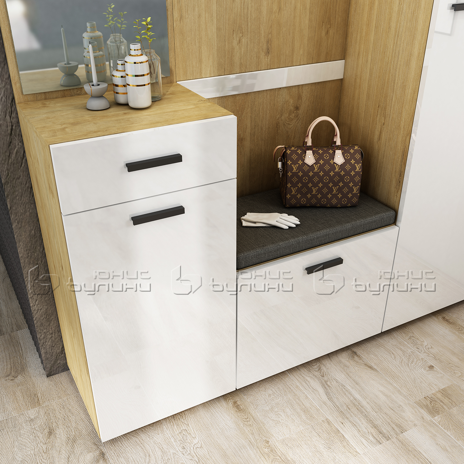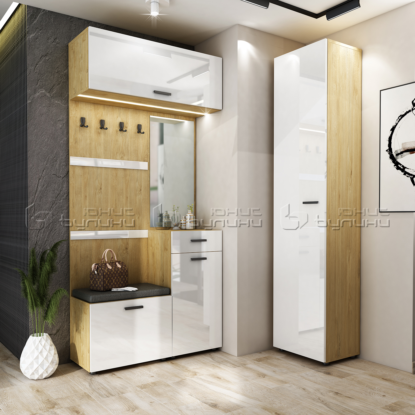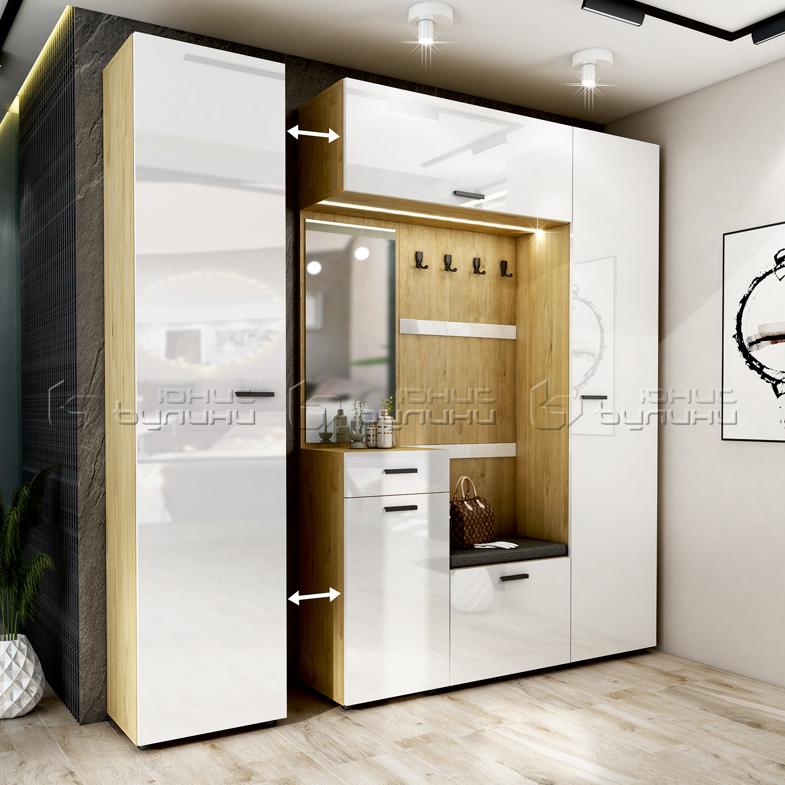 Цветовата комбинация от дървесен цвят и гланц е не само привлекателна, но и много практична, тъй като лесно се поддържа и същевременно добавя светлина и простор на антрето. Размерите на портмантото го правят идеално както за по-малки, така и за по-просторни помещения, като същевременно осигуряват достатъчно място за съхранение на всичко необходимо.