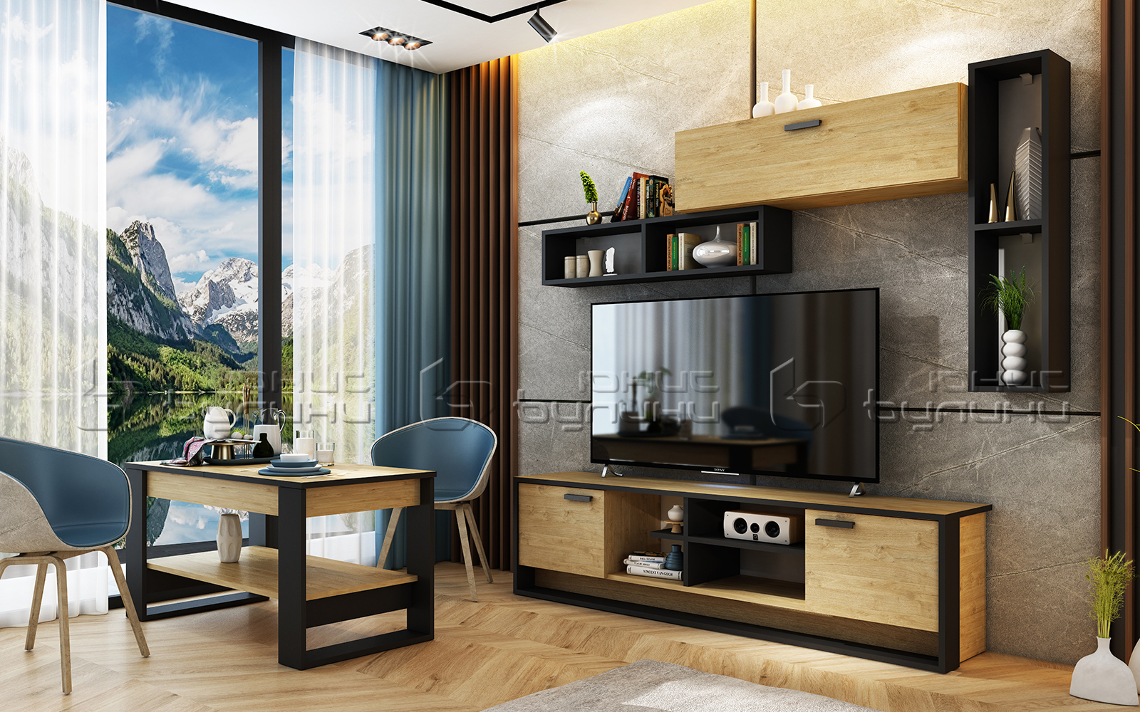 - Модул 1: Основният модул на секцията е с ширина 1800 мм / дълбочина 410 мм / височина 500 мм. Това е идеалното място за поставяне на телевизор или други мултимедийни устройства. Със своето просторно пространство и стабилна конструкция, този модул е не само естетически привлекателен, но и функционален.
