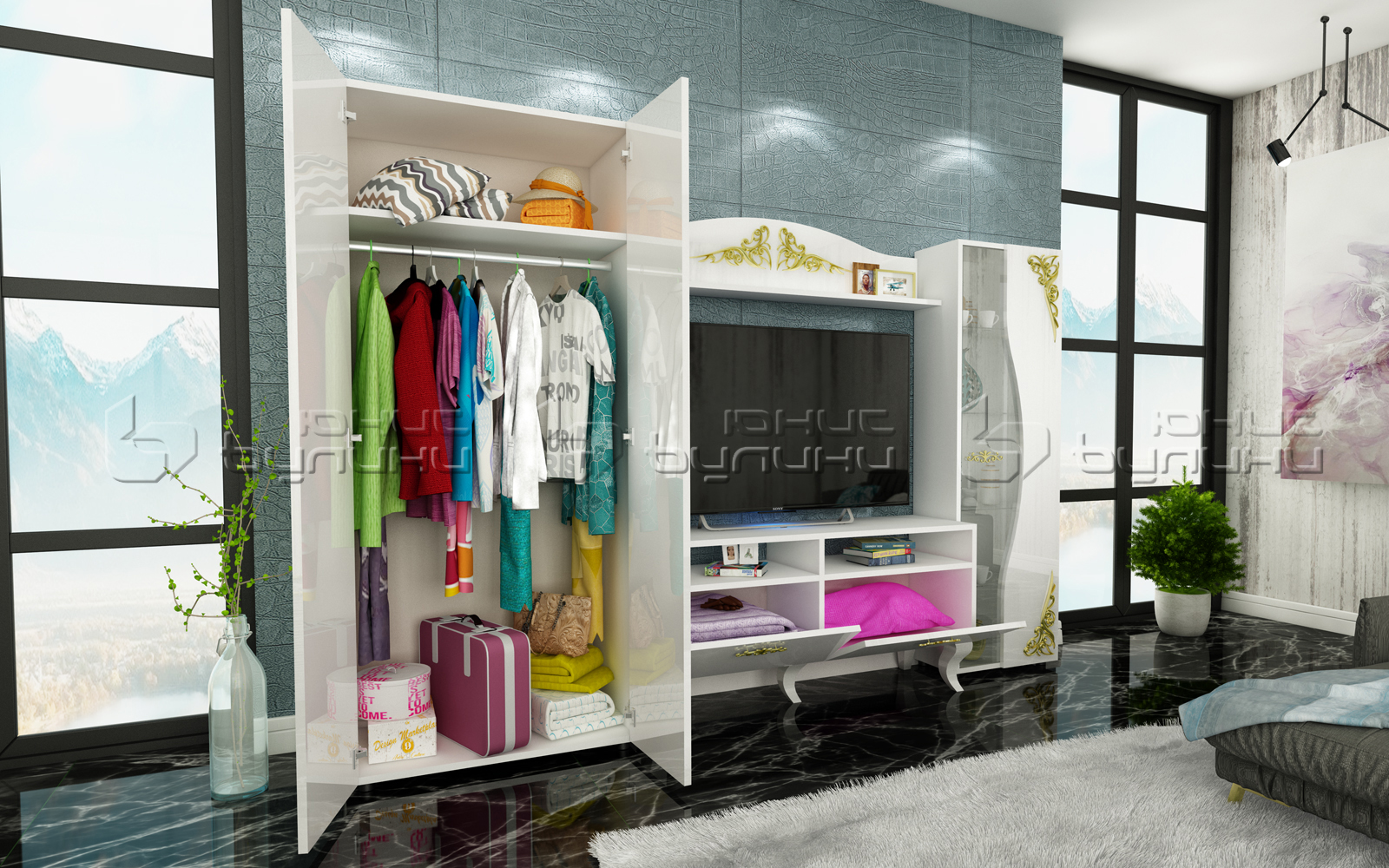 - Практичност – Секцията предлага много място за съхранение, като съчетава естетика и функционалност. Независимо дали имате нужда от място за телевизор или искате да организирате вещите си, секция Изабела ще удовлетвори всички ваши нужди.