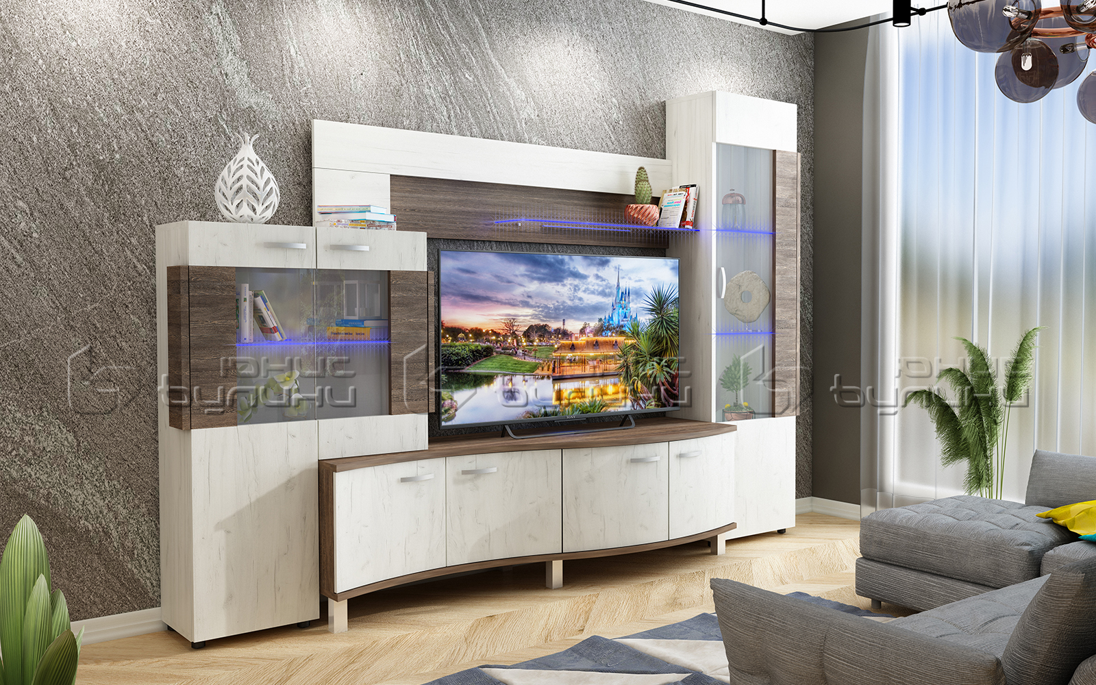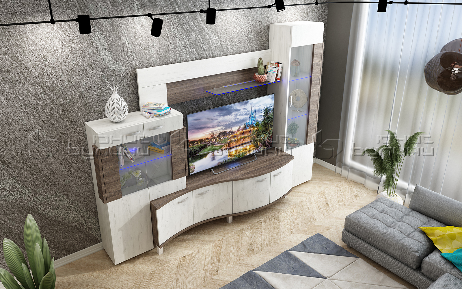 Секция Плей съчетава модерен дизайн с функционалност, която задоволява дори най-взискателните клиенти. Тя се състои от двоен шкаф-витрина, отворена етажерка, която предлага допълнително пространство за декорации и други аксесоари, висок шкаф с елегантна стъклена витрина, а акцентът пада върху уникалния долен шкаф с извити врати. Не можем да пропуснем и иновативното LED осветление в синьо, което придава на секцията допълнителна модерна нотка и създава приятна атмосфера във Вашия хол. Ето основните характеристики на секция Плей: