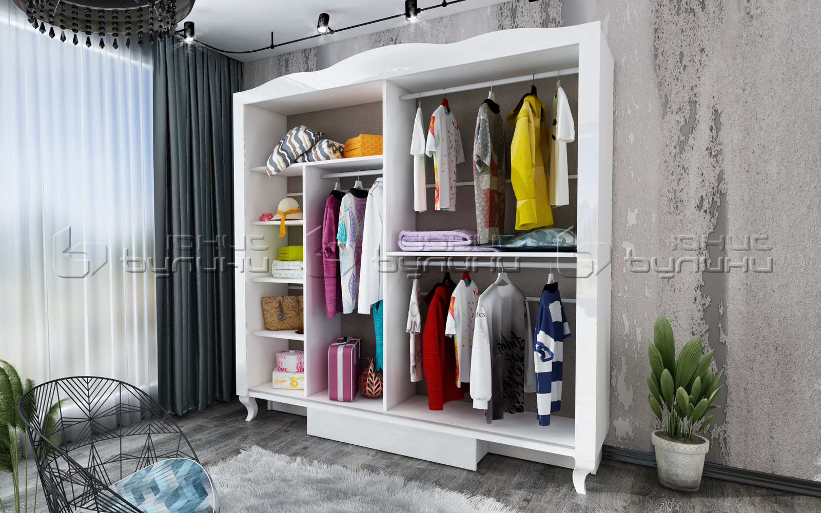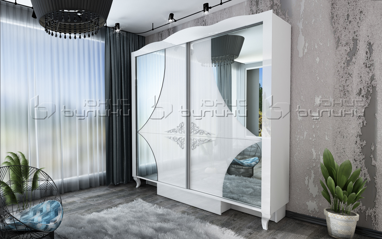 Просторният гардероб с плъзгащи врати е идеалното решение за съхранение на вашите дрехи и аксесоари. С ергономичната организация на вътрешното пространство, той предлага достатъчно място за всичко необходимо. Огледалните врати не само добавят изтънченост, но и създават илюзия за по-голямо пространство, а елегантните орнаменти подчертават изискания му дизайн.
