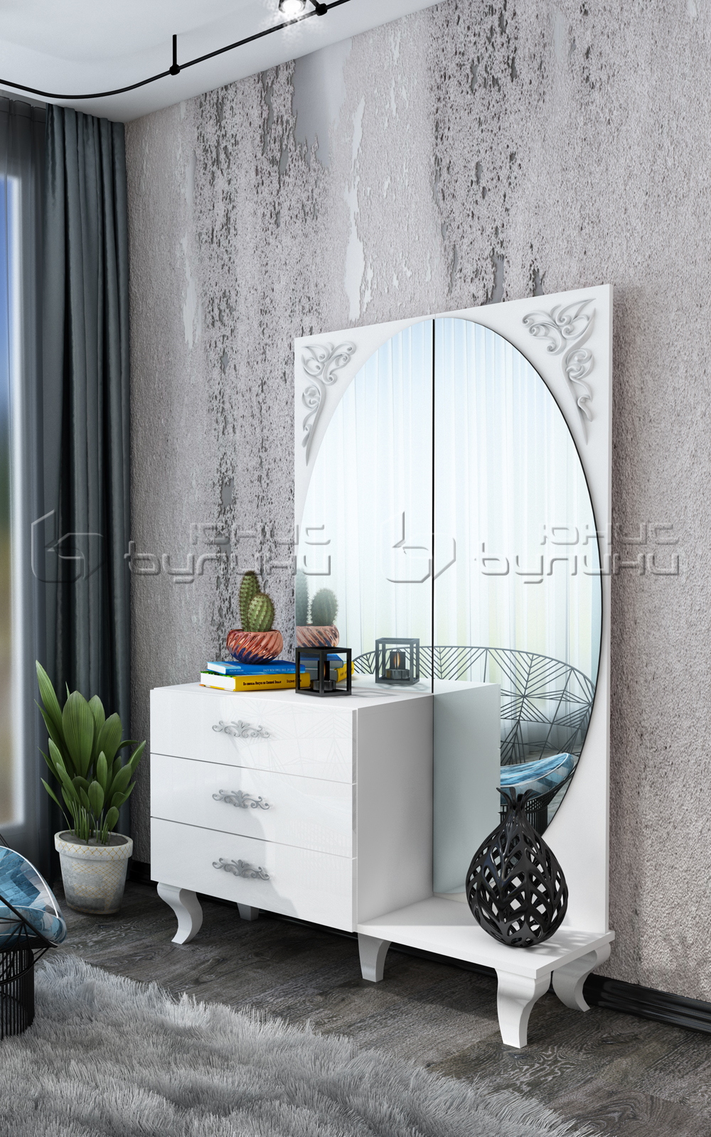 Със своя изящен дизайн, тоалетката е идеалното допълнение към вашия спален комплект. Тя предоставя достатъчно място за съхранение на козметика и аксесоари, като същевременно служи като стилен елемент във вашата спалня. Голямото огледало не само предлага практичност, но добавя и естетика към общата визия, като създава усещане за визуален простор.