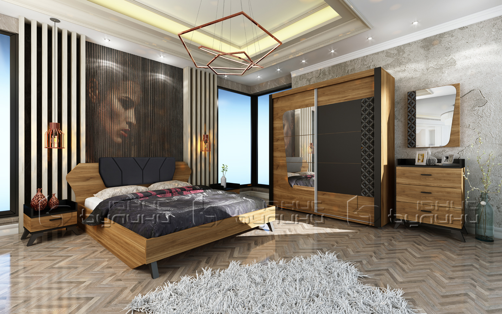 - Функционалност: Спалният комплект включва всички необходими елементи за пълноценна спалня - легло, гардероб, скрин и огледало, като всичко е проектирано с мисъл за практичност и удобство.