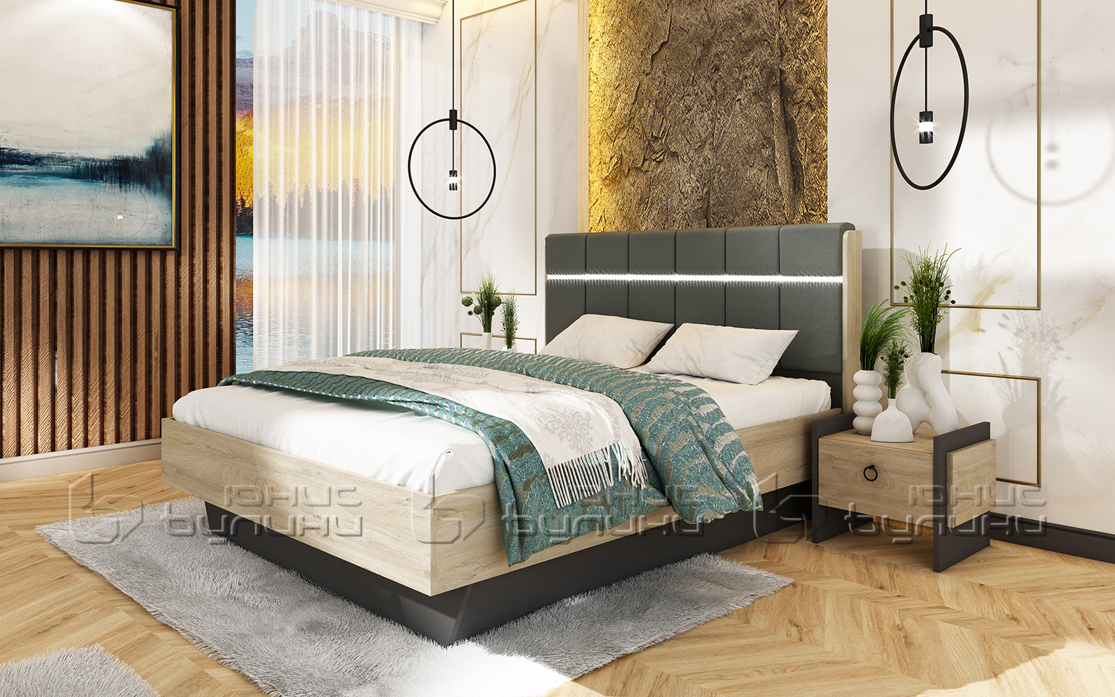 Спален комплект Комфорт е изработен от висококачествено ПДЧ с дебелина 16 мм, което осигурява дълготрайност и устойчивост на мебелите. ПДЧ е известен със своите отлични свойства на издръжливост и лесна поддръжка, което го прави идеален избор за мебели, които ще бъдат използвани ежедневно. Освен това, този материал предлага естетичен вид и се интегрира добре в различни интериорни стилове. Един от основните дизайнерски акценти на спалния комплект Комфорт е тапицираната табла на леглото с вградено LED осветление. Тази особеност не само че придава модерен и изтънчен вид на спалнята, но също така осигурява допълнителна функционалност. LED осветлението създава приятна и уютна атмосфера, идеална за четене или релаксация преди лягане.