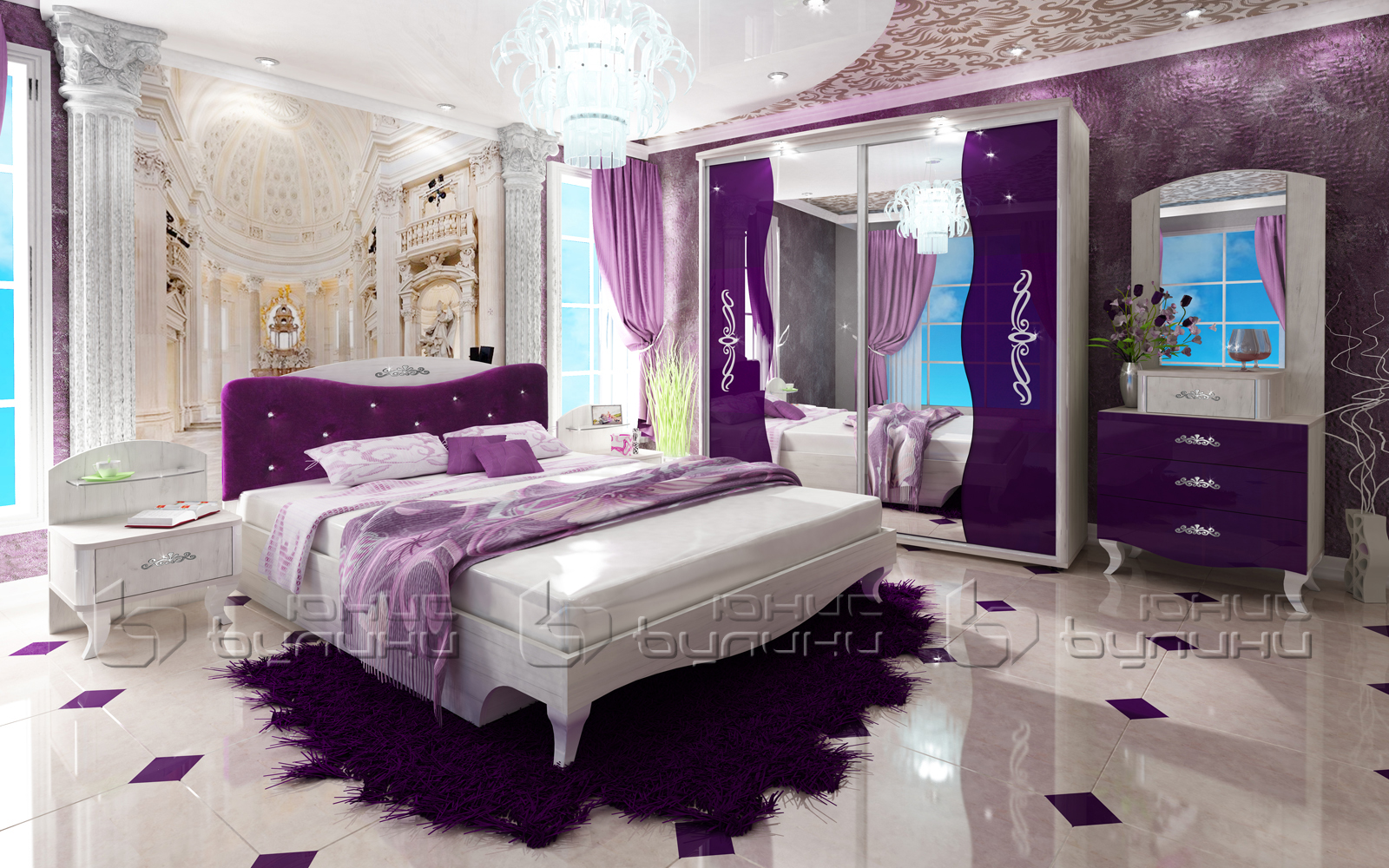 Спалнята в този комплект е проектирана така, че да осигури максимален комфорт и естетика. С размери 2640 мм ширина, 2070 мм дължина и 910 мм височина, тя е подходяща за всяка спалня, предлагайки достатъчно пространство за релакс и сън. Размерът на матрака е 1600/2000 мм – идеалният размер за двама души, който предоставя оптимално удобство. Една от отличителните черти на тази спалня е тапицираната табла. Изработена с лилаво кадифе и украсена с кристални камъни, тя придава изтънченост и луксозен вид на цялото помещение. Тази табла не само подобрява визуалния облик, но също така осигурява комфорт при облягане, което е особено полезно, ако обичате да четете или гледате телевизия преди сън. За допълнително удобство, спалнята разполага с механизми за повдигане с амортисьори. Това улеснява достъпа до подматрачното пространство, което може да се използва за съхранение на постелки, завивки или други вещи. Така ще можете да поддържате спалнята си организирана и подредена, без излишни усилия.